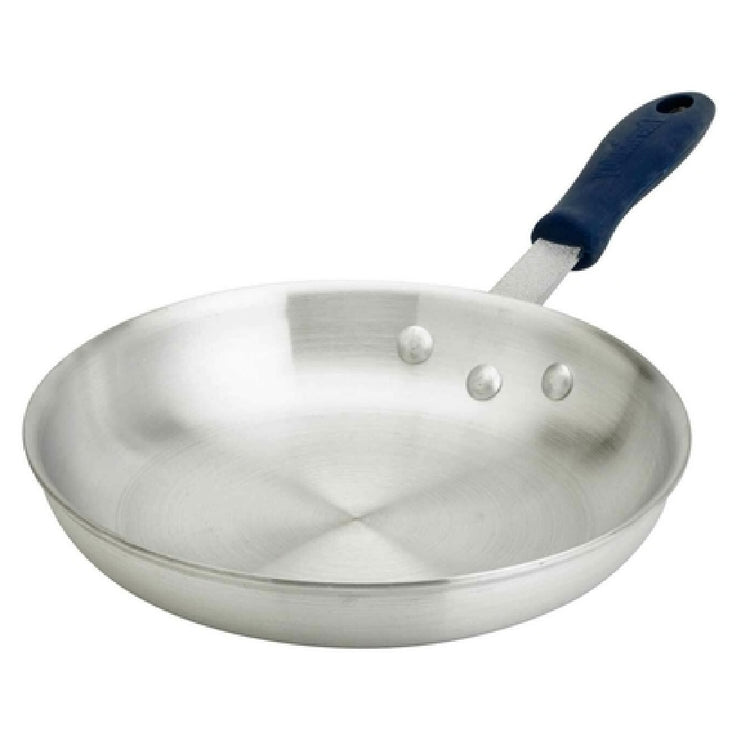 The Browne Foodservice 5814814 Thermalloy® Fry Pan 14" Dia. x 2-1/2" Without Cover is a high-performance cooking essential that stands out for its exceptional durability and versatility, meeting the diverse needs of professional kitchens. Crafted with a heavy-weight, 5-gauge aluminum construction, this fry pan offers excellent heat conductivity and retention, ensuring uniform cooking results. Its natural finish adds a sleek and professional appearance while remaining easy to maintain. The ergonomic handle, designed with off-set rivets, enhances comfort and safety during use, and comes equipped with a removable blue silicone sleeve that is heat resistant up to 572°F, making it suitable for rigorous cooking environments. This versatile fry pan is compatible with various heat sources including gas, electric, ceramic, and halogen, broadening its application across different cooking platforms. NSF certification underscores its adherence to high standards of safety and sanitation in food service operations. The Browne Foodservice 5814814 Thermalloy® Fry Pan is an indispensable tool in the culinary industry, offering reliable performance and durability for chefs and kitchen professionals focused on delivering quality dishes efficiently.