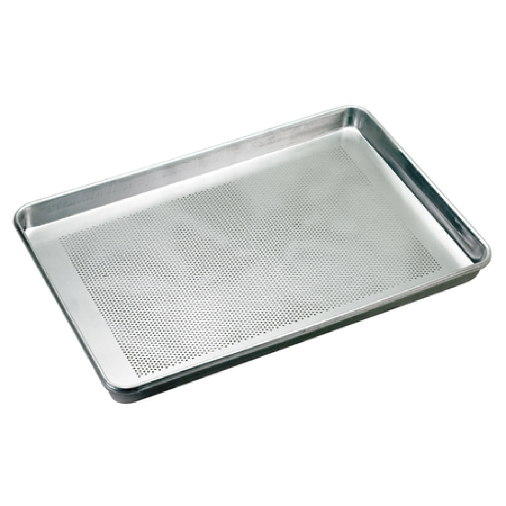 The Browne Foodservice 58182641 Thermalloy® Bun Pan Full Size 18" X 26" X 1" Deep is a full-sized baking essential crafted for professional kitchens and bakeries. This pan measures 18 inches by 26 inches with a depth of 1 inch, making it an ideal choice for baking a variety of items from pastries to bread. Its design features a perforated bottom, which enhances air circulation for even baking and browning, a critical factor for achieving perfect results. The rounded corners add a layer of safety and ease of handling, while the perimeter reinforcing wire ensures the pan maintains its shape even under high temperatures. Constructed from 18-gauge aluminum with a 1.0 mm thickness, this pan is not only lightweight but also offers excellent heat conductivity and durability. Its stackable design is a space-saving feature, crucial for maximizing storage efficiency in bustling kitchen environments. The Thermalloy® Bun Pan stands out with its combination of structural integrity and functional design, making it an invaluable tool for both small bakeries and large-scale food service operations looking to maintain quality and consistency in their baked goods production.