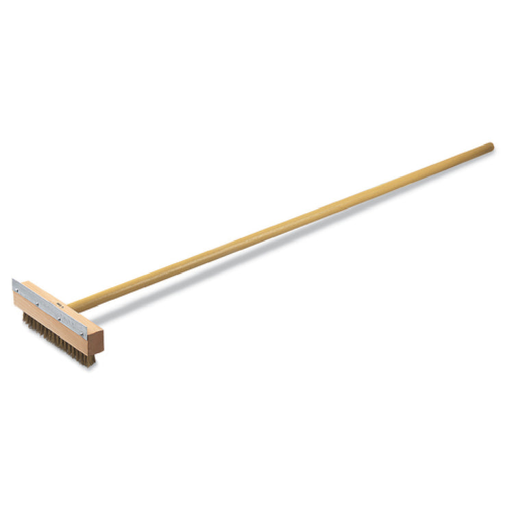 The Browne Foodservice 611001 Oven Brush is a meticulously crafted cleaning tool ideal for maintaining ovens in commercial kitchens and bakeries. This oven brush features a 36-inch handle, providing extended reach to clean deep and hard-to-access areas with ease. Its brush block measures 10 inches by 1-1/2 inches, offering a substantial cleaning surface for efficient dirt and grime removal. The brush is equipped with brass wire bristles, valued for their durability and ability to withstand high temperatures while effectively scrubbing away baked-on residues. The solid wood block ensures stability and longevity, providing a sturdy base for the bristles and scraper. Additionally, the steel scraper is an integral part of this tool, designed to tackle stubborn, hardened deposits that the bristles alone cannot remove. This combination of features makes the Browne Foodservice 611001 Oven Brush an essential tool for professionals in the foodservice industry, particularly those specializing in baking and cooking where oven maintenance is crucial. Its robust construction and thoughtful design cater to different segment markets within the industry, ensuring effective cleaning and maintenance of ovens, ultimately supporting high standards of hygiene and efficiency in food preparation environments.
