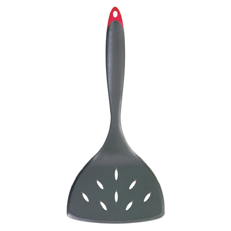 The Browne Foodservice 7112322 Cuisipro Turner is a highly versatile kitchen tool designed for efficiency and durability. Featuring a 3-3/4" x 5" blade, this turner is engineered to handle a wide range of tasks with precision. The overall length of 11-1/4" offers an optimal reach and control for culinary professionals and home cooks alike. Its wide, perforated blade is crafted from high-quality fiberglass, providing lightweight strength and making it an ideal choice for flipping, turning, or lifting foods with ease. This turner is heat-resistant up to 480°F (250°C), ensuring safety and durability even in high-temperature cooking environments. The product also includes a practical red hanging loop for convenient storage, adding a splash of color to its sleek black design. Perfect for both commercial foodservice operations and domestic kitchens, the Browne Foodservice 7112322 Cuisipro Turner combines functionality with style, making it a valuable addition to any culinary toolkit. Its innovative design meets the demands of diverse cooking needs, offering reliability and performance that cater to various segment markets within the industry.