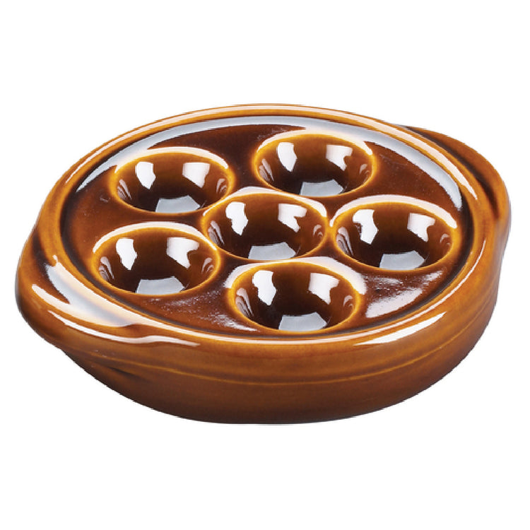 The Browne Foodservice 744046 Escargot Plate is a meticulously designed piece of stoneware, ideal for various dining settings that seek both functionality and aesthetic appeal. This plate, measuring 5-3/10 inches in diameter and 1-1/2 inches in height, features six dedicated holes tailored explicitly for serving escargot. Its unique design not only enhances the presentation of this delicacy but also ensures each serving is kept separate and secure. Crafted from durable stoneware, this plate offers both durability and a classic brown finish that complements a wide range of table settings. The Browne escargot plate's dimensions and material make it suitable for upscale restaurants and catering services that prioritize both style and service efficiency. Its specific sizing and hole configuration make it an indispensable tool for chefs who specialize in French cuisine, offering a reliable serving solution that can withstand the demands of a professional kitchen environment while maintaining elegance. This product stands out in the foodservice industry for its specialized functionality combined with traditional aesthetic values, providing a high-quality serving option for escargot that meets the nuanced needs of restaurateurs and culinary experts alike.