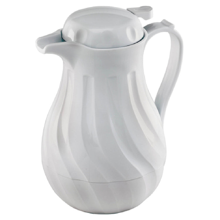 The Browne Foodservice 744220 Beverage Server is a versatile and durable solution for professionals in the hospitality industry. With a capacity of 20 oz. and standing 7-1/2" tall, this server is designed to accommodate a variety of beverage needs. Its swirl design not only adds an aesthetic appeal but also provides a practical grip. The inclusion of a thumb lever offers ease of use, making it ideal for fast-paced environments. Constructed with a polycarbonate liner and polyurethane foam insulation, this server maintains temperature effectively, ensuring beverages stay fresh longer. Its ABS plastic exterior is both odorless and stain-resistant, promoting a hygienic and clean presentation. To further complement its functionality, the server includes orange, brown, and green identification tabs, allowing for easy beverage differentiation. The recommendation for hand washing ensures the longevity of the product's components. This white beverage server is an excellent choice for catering events, restaurants, and hotels, offering efficiency and style in beverage presentation.