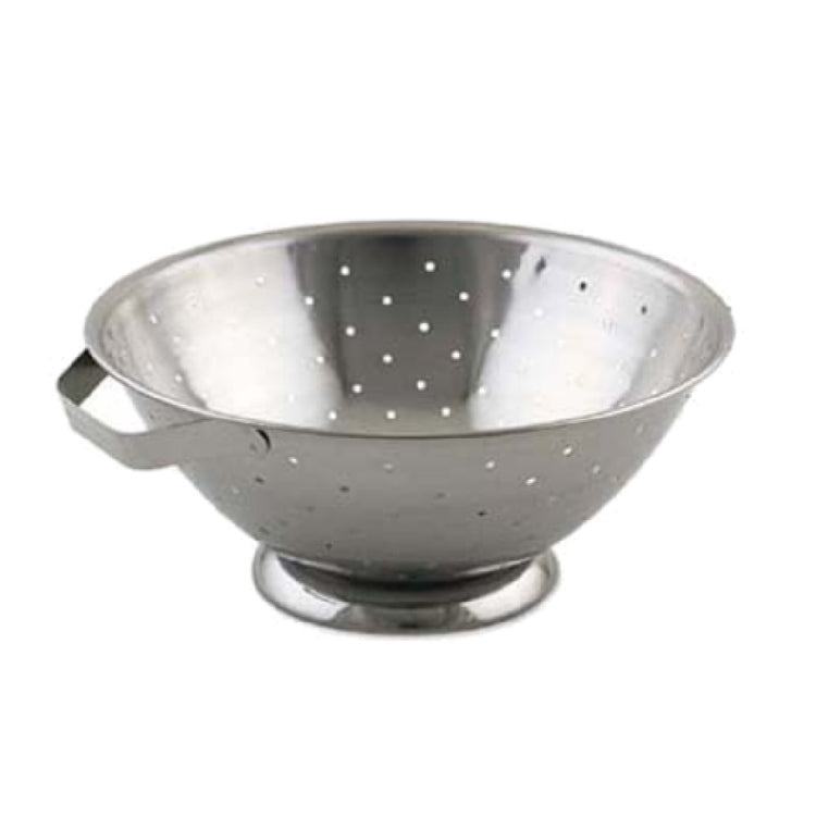 The Browne Foodservice 746111 Colander 13 Qt. 15-1/4" Dia. is a versatile kitchen essential engineered for efficiency and durability. With a generous 13-quart capacity and a 15-1/4 inch diameter, this colander is perfectly suited for handling a variety of tasks in commercial and home kitchens alike. Its footed base ensures stability on countertops, while the twin handles provide a secure grip for easy maneuverability. Crafted from high-quality stainless steel, the colander features a sleek mirror finish, adding a touch of elegance to its robust functionality. The material's 0.4 mm thickness ensures long-lasting resilience against rigorous use, making it an invaluable asset for foodservice professionals who require reliable performance. Whether draining pasta, rinsing fruits and vegetables, or straining large batches of food preparations, this colander meets diverse culinary needs with efficiency. Its durable construction and practical design cater to distinct segments within the food industry, from restaurant kitchens that demand high-volume processing to artisanal food producers seeking quality equipment. The Browne Foodservice Colander combines practicality with style, offering a durable and aesthetically pleasing solution for both everyday use and specialized culinary applications.