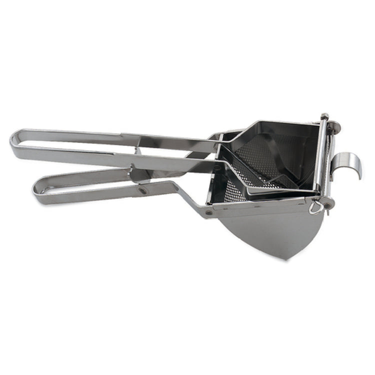 The Browne Foodservice 746193 Potato Ricer is a meticulously designed kitchen tool, perfect for achieving smooth, lump-free mashed potatoes. Measuring 17 inches in length, it provides ample leverage for efficient operation. The 5" x 4-1/2" cup size is ideal for processing large portions, making it suitable for both home kitchens and professional foodservice environments. Constructed with a welded frame, this potato ricer is built for heavy-duty use, ensuring durability and long-lasting performance. The stainless steel construction not only adds to its robust nature but also ensures easy cleaning and maintenance, resisting corrosion and maintaining hygiene standards. This versatile kitchen tool meets the needs of various segment markets, from small-scale catering services to large-scale restaurant operations, offering reliability and consistent performance in food preparation. Whether you are crafting gourmet mashed potatoes or preparing baby food, the Browne Foodservice 746193 Potato Ricer stands out as an essential appliance, enhancing the quality and efficiency of your culinary tasks.