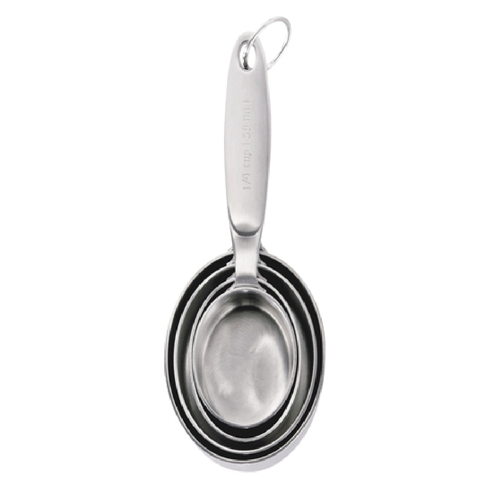 The Browne Foodservice 747141 Cuisipro Measuring Cup Set is a meticulously crafted set that combines functionality with durability, tailored for culinary enthusiasts and professional chefs alike. This set includes four nesting cups - 1/4 cup, 1/3 cup, 1/2 cup, and 1 cup - offering a range of precise measurement options essential for accurate cooking and baking. Each cup is designed with an oval bowl shape, which facilitates easy scooping from narrow containers and minimizes spills. The engraved measurements on the cups ensure long-lasting readability and usability, a significant advantage in both commercial kitchens and home cooking environments where precision is paramount. Constructed from high-quality stainless steel, this measuring cup set ensures longevity and resistance to rust and stains, making it an ideal choice for high-frequency use. The nesting feature of the cups promotes space-saving storage, a valuable attribute in both compact home kitchens and crowded professional settings. This measuring cup set is a versatile and indispensable tool, providing accuracy, durability, and convenience for diverse market segments within the foodservice industry, from gourmet restaurants to home bakers seeking professional-grade equipment.