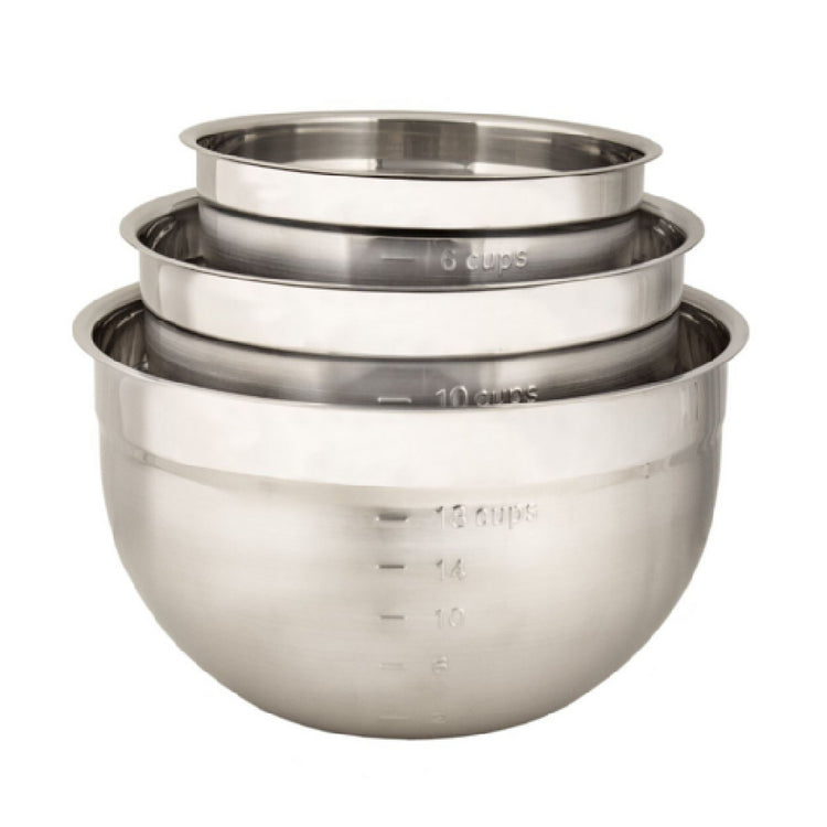 - 3-Piece mixing bowl set with 6, 12, and 18 cup capacities