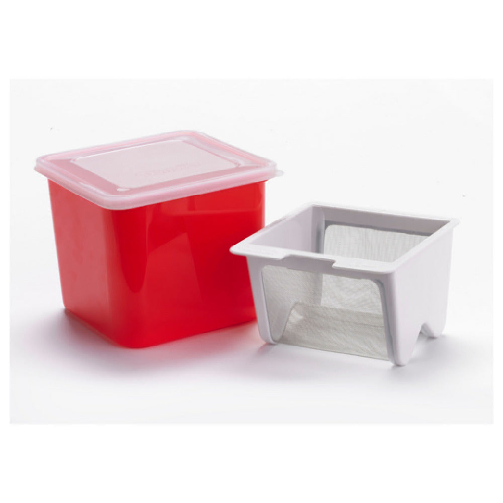The Browne Foodservice 74742605 CUISIPRO Yogurt Cheese Maker is a compact and efficient kitchen tool designed to transform 3 cups of yogurt into 1 cup of creamy yogurt cheese within a 24-hour period. Measuring 5.7 inches in length, 5.7 inches in width, and 4.7 inches in height, this yogurt cheese maker is crafted from durable plastic, ensuring longevity and ease of use. The sealed container feature is noteworthy as it effectively prevents odor transfer, maintaining the yogurt cheese's freshness and flavor. In addition, it offers convenient storage solutions, making it an ideal choice for both commercial and home kitchens. The sleek red design adds a pop of color to any kitchen setup, while the dishwasher-safe component simplifies cleaning and maintenance. This product is particularly valuable for foodservice professionals and culinary enthusiasts alike who seek to expand their offerings with homemade yogurt cheese, leveraging its compact design and efficient conversion capability. The Browne Foodservice CUISIPRO Yogurt Cheese Maker is an excellent addition to any culinary setting, providing a specialized tool for creating delicious, homemade yogurt cheese with ease and precision.