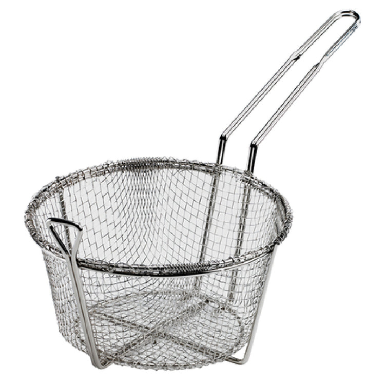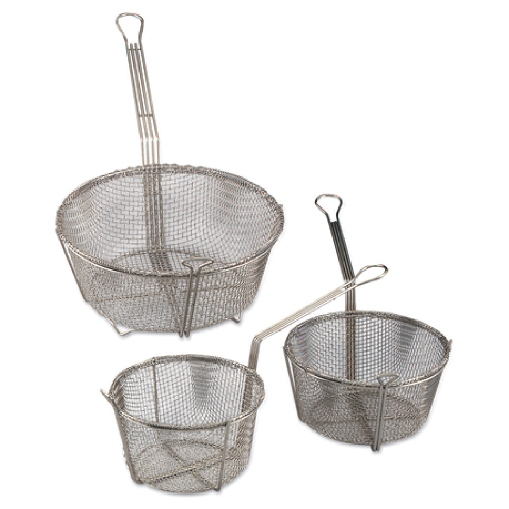 The Browne Foodservice 79100 Fry Basket is a high-quality kitchen tool designed for efficiency and durability, featuring a 9-1/2" diameter and a height of 5-1/8". This basket's medium mesh construction is expertly crafted to provide optimal frying capabilities, ensuring even cooking and crisp results. Made with a robust wire frame, this fry basket is nickel-plated for enhanced corrosion resistance and longevity, making it an ideal choice for various kitchen environments, from small cafes to high-volume restaurants. The medium mesh size allows for versatility in frying a variety of food items while preventing smaller pieces from falling through, a feature that can be particularly beneficial for establishments focused on diverse menu offerings. The Browne Foodservice 79100 Fry Basket's sturdy construction and thoughtful design cater to the needs of professional chefs and food service operators who prioritize reliability and performance in their kitchen equipment. Its dimensions make it suitable for different fryer sizes, providing flexibility and adaptability in various cooking setups. This fry basket is a testament to functional design meeting practical application, making it a valuable asset to any culinary operation seeking to optimize their frying processes with a trusted and proven kitchen accessory.