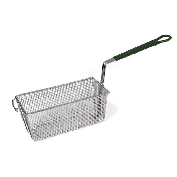 The Browne Foodservice 79213 Fry Basket - 12.5" x 6.25" x 5" Rectangular is an expertly designed kitchen tool tailored to meet the demands of various segments within the foodservice industry. Measuring 12.5 inches in length, 6.25 inches in width, and 5 inches in depth, this rectangular fry basket is ideal for efficiently frying a variety of foods. Its single wire construction, combined with a durable nickel-plated finish, provides robustness and longevity, making it a reliable choice for high-volume commercial kitchens. The green handle not only offers an ergonomic grip but also aids in easy identification and handling, reducing the risk of kitchen accidents. This feature is particularly beneficial for fast-paced environments where quick and safe operations are paramount. Designed for both practicality and resilience, the Browne Foodservice 79213 Fry Basket fits seamlessly into any professional kitchen setup, enhancing workflow efficiency and ensuring consistent frying results. Whether used in a bustling restaurant, a catering service, or a food truck, this fry basket brings exceptional value through its precision engineering and thoughtful design, meeting the diverse needs of culinary professionals across different market segments.