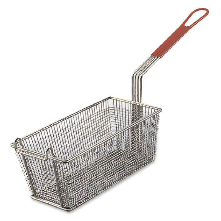 The Browne Foodservice 79216 Fry Basket 12.5" x 6.25" x 5" Rectangular is meticulously designed to meet the rigorous demands of commercial kitchens, making it a valuable tool for chefs and culinary professionals. With dimensions of 12.5 inches by 6.25 inches by 5 inches, this rectangular fry basket is crafted to efficiently handle medium-sized frying tasks. Its single wire construction ensures durability under high-heat conditions, while the nickel-plated finish offers enhanced corrosion resistance, extending the product's lifespan even with frequent use. The fry basket features a distinctive red handle, providing a comfortable grip and easy identification in busy kitchen environments. This handle design not only adds a touch of color but also enhances safety by remaining cool to the touch, thus reducing the risk of burns. Whether it's a bustling restaurant kitchen or a fast-paced catering service, the Browne Foodservice 79216 Fry Basket is engineered to deliver consistent performance, reliability, and safety. Its robust construction and user-friendly features make it an ideal choice for foodservice professionals seeking efficient and reliable frying solutions tailored to industrial demands.