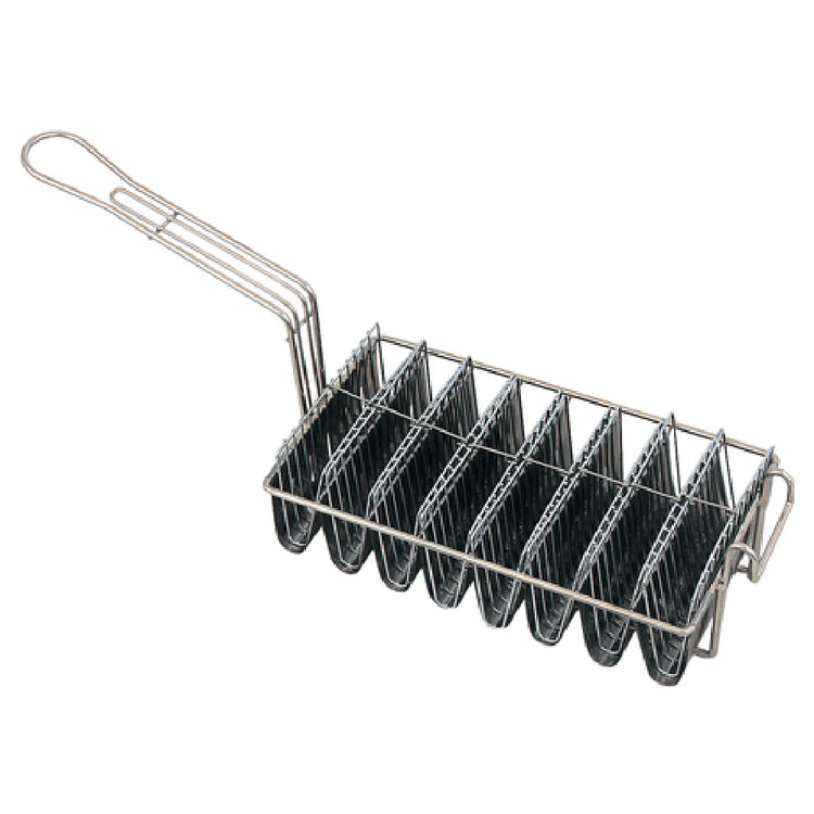 The Browne Foodservice 79218 Taco Basket is engineered to enhance kitchen efficiency with its precise dimensions of 12 inches by 6-1/2 inches by 3 inches, featuring a convenient handled design. This taco basket is tailored specifically for use in 28 to 35-pound or larger fry kettles, making it an indispensable tool for high-volume food service settings. Its capacity to hold 8 taco shells simultaneously allows for uniform frying and consistent product quality. Constructed with a heavy-duty framework, the basket's polished chrome finish not only provides a sleek, professional appearance but also ensures durability and resilience in demanding kitchen environments. The inclusion of a fry kettle hook enhances operational convenience, facilitating easy handling and secure placement during use. The Browne Foodservice 79218 Taco Basket caters to a diverse range of food service markets, from bustling commercial kitchens to specialized Mexican cuisine establishments, offering a reliable solution for efficiently producing perfectly crispy taco shells. Its robust construction and thoughtful design make it a valuable addition to any culinary operation seeking to optimize frying processes while maintaining high standards of food quality and presentation.