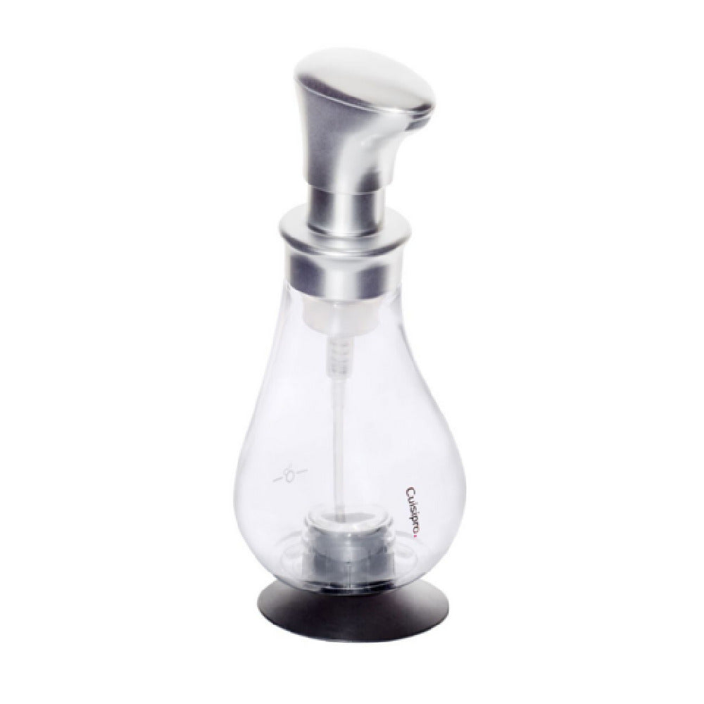 The Browne Foodservice 83758021 CUISIPRO Foam Pump Dispenser is a meticulously designed product, measuring 8.3"/21cm in height and 3.6" L X 3.6" W X 8.75" H, crafted to enhance efficiency in both residential and commercial settings. It features a silver pump mechanism that transforms liquid soap and water into a thick foam, providing a non-aerosol option that is both environmentally friendly and cost-effective. The innovative design includes two fill levels for soap and water, significantly reducing soap consumption by up to 75%. The dispenser's suction cup base ensures stability on any surface, preventing unwanted movement during use. Although it requires handwashing for maintenance, the sturdy plastic construction guarantees longevity and durability. The Browne Foodservice 83758021 CUISIPRO Foam Pump Dispenser stands out in the market for its ability to efficiently manage soap usage while maintaining a sleek and functional design, making it an invaluable tool for various segments within the foodservice and hospitality industries, as well as for individual consumers seeking to reduce waste and enhance their handwashing experience. This product's thoughtful engineering ensures it delivers reliable performance and sustainability, catering to a wide range of users with specific needs and preferences.