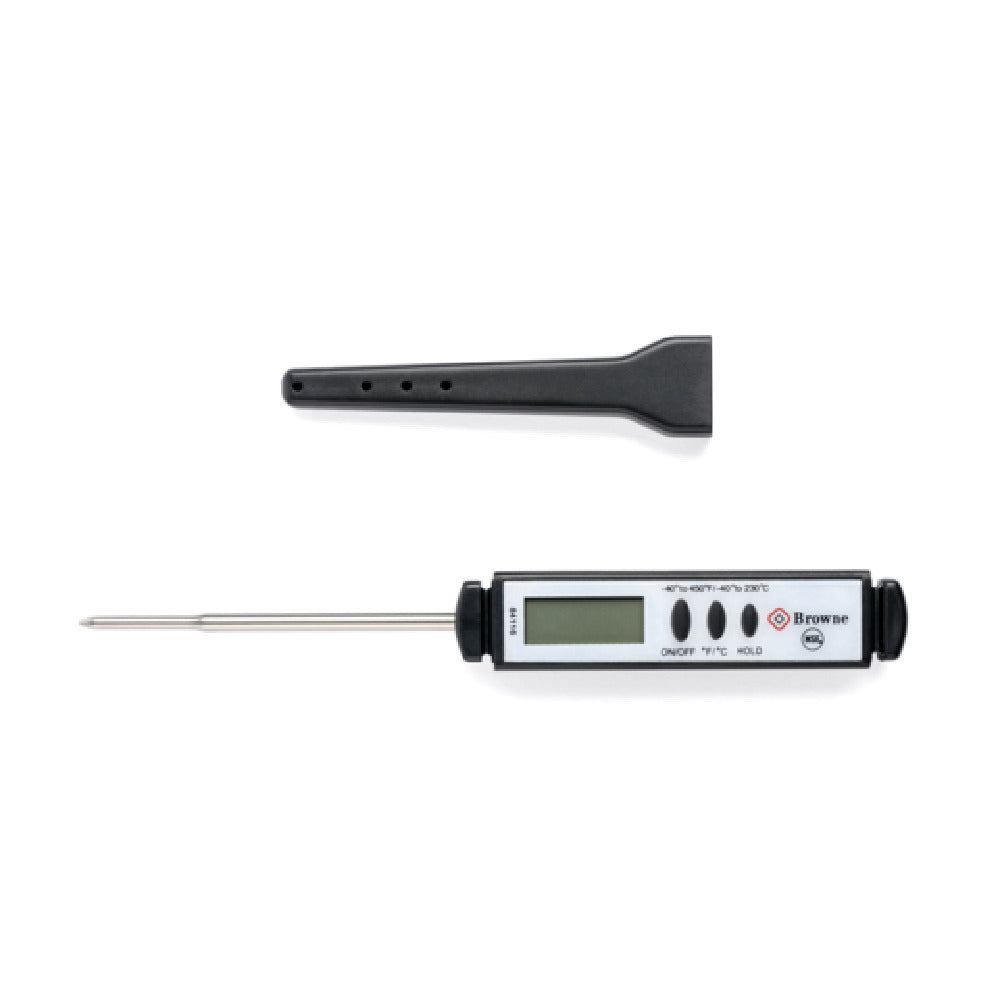The Browne Foodservice 84116 Digital Pocket Thermometer is a compact and precise tool designed for professional kitchens and foodservice applications. With a 2.5mm thin tip, the thermometer ensures accurate temperature readings, essential for chefs and culinary professionals focusing on precision. Its stainless steel stem measures 2.75 inches (7.0 cm) in length, providing durability and resilience in various cooking environments. This thermometer boasts a wide temperature range from -40°F to 450°F (-40°C to 230°C), accommodating a variety of cooking needs from deep freezing to high-temperature cooking, making it versatile for multiple culinary tasks. The unit is shatterproof, enhancing its durability in high-paced kitchen settings. An auto shut-off feature activates after 20 minutes of inactivity, preserving battery life and adding convenience for busy users. The included sheath not only protects the probe but can also serve as a handle extension, offering additional reach and safety during use. A storage case with a pocket clip is included, allowing for easy portability and accessibility. The Browne Foodservice 84116 Digital Pocket Thermometer delivers reliable performance and durability, making it a valuable tool for chefs, caterers, and food safety personnel seeking efficient and precise temperature monitoring solutions.