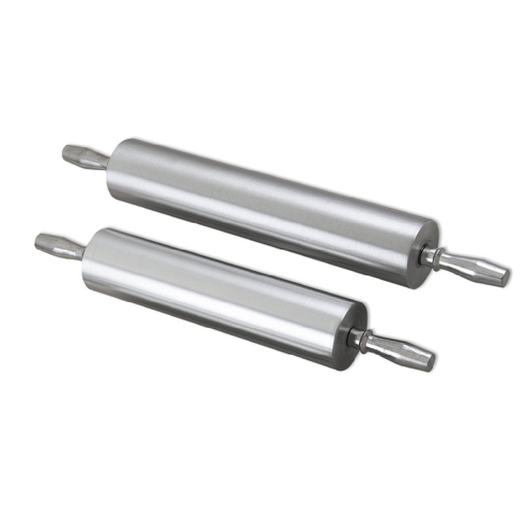 The Browne Foodservice 844715 Rolling Pin 23-1/2" OAL 15"L Barrel is an expertly crafted tool designed for both commercial kitchens and dedicated baking enthusiasts. With an overall length of 23-1/2 inches and a barrel length of 15 inches, this rolling pin offers ample size for a range of rolling tasks. Its 3-1/2 inch diameter barrel is constructed from durable cast aluminum, ensuring a sturdy and reliable performance even under heavy use. The incorporation of a ball bearing roller enhances the smoothness and efficiency of its operation, allowing for effortless dough rolling without unnecessary strain. This aluminum rolling pin is particularly advantageous in professional baking environments where consistent and precise dough thickness is crucial. Its robust design suits various industrial foodservice applications, while its quality construction makes it a valuable tool for artisan bakers looking for longevity and outstanding performance. The Browne Foodservice 844715 stands out for its balance of traditional craftsmanship and modern engineering, making it a versatile choice for any culinary setting that demands precision and durability in dough preparation. Its technical specifications ensure it meets the needs of diverse segments within the foodservice industry, from high-volume commercial bakeries to specialized pastry chefs.