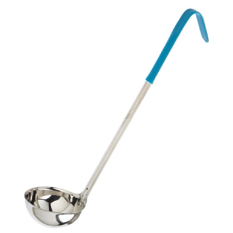 The Browne Foodservice 9946TL Ladle 6 Oz. 13"L is a meticulously crafted kitchen tool that stands out in the industry for its precision and durability, making it an essential asset for foodservice establishments. Engineered as a one-piece unit, this ladle boasts a stainless steel construction with a thickness of 1.0 mm, ensuring lasting strength and resistance to wear over time. Its handle, made from teal polypropylene, is designed to withstand temperatures up to 392°F (200°C), offering reliability in high-heat environments. The ladle's 6-ounce capacity is ideal for portion control, catering to both commercial kitchens and culinary professionals who require consistency and efficiency in serving. With a length of 13 inches, it provides the perfect balance between reach and control, reducing the risk of spills and enhancing precision in serving. The Browne Foodservice 9946TL Ladle seamlessly integrates functionality with durability, making it a versatile tool suitable for various segments of the foodservice industry, from large-scale catering operations to intimate restaurant settings. Its thoughtful design not only meets but exceeds the rigorous demands of professional kitchens, offering unmatched performance and enduring quality in a single, elegantly crafted tool.
