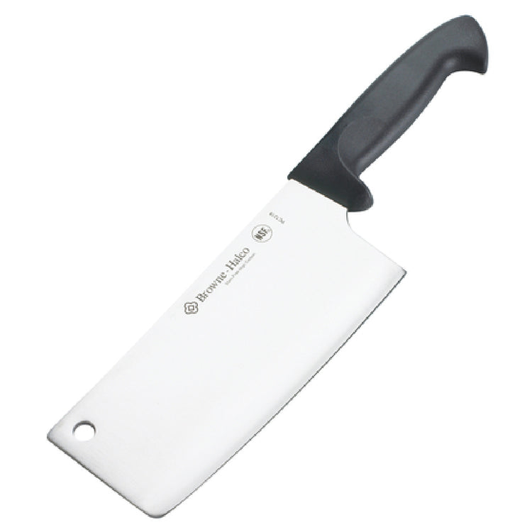 The Browne Foodservice PC1216 Cleaver - 6"L Stainless Steel Blade ABS Handle is an expertly crafted tool designed for precision and durability in a variety of culinary settings. Featuring a 6-inch blade made from high-quality stainless steel, this cleaver is engineered for superior sharpness and longevity, making it an essential asset in any professional kitchen environment. It is equipped with a black ABS handle, providing a secure and comfortable grip, which enhances control and reduces user fatigue during prolonged use. This cleaver is NSF certified, ensuring it meets stringent public health and safety standards, a critical attribute for catering facilities and large-scale food operations. Packaged in a blister card, the Browne Foodservice PC1216 Cleaver is not only practical but also well-suited for retail presentation. Whether you are a professional chef, a butcher, or a culinary enthusiast, this cleaver offers a reliable and efficient solution for cutting through meats and large vegetables with ease. Its robust design and adherence to safety standards make it a versatile tool adapted to the diverse needs of the foodservice industry. This cleaver embodies a combination of precision, safety, and reliability, making it a valuable addition to any kitchen toolkit.