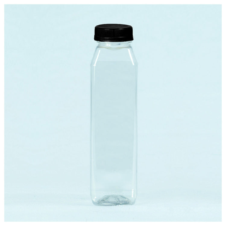 Buccaneer Container Corp, 31510120201, (Buccaneer) Juice Bottles, 12 oz., tall, square, empty, combo packed with black lids, Clear PET, (custom printed), (151 each per case) (Packed By: 151 Each Per Case)