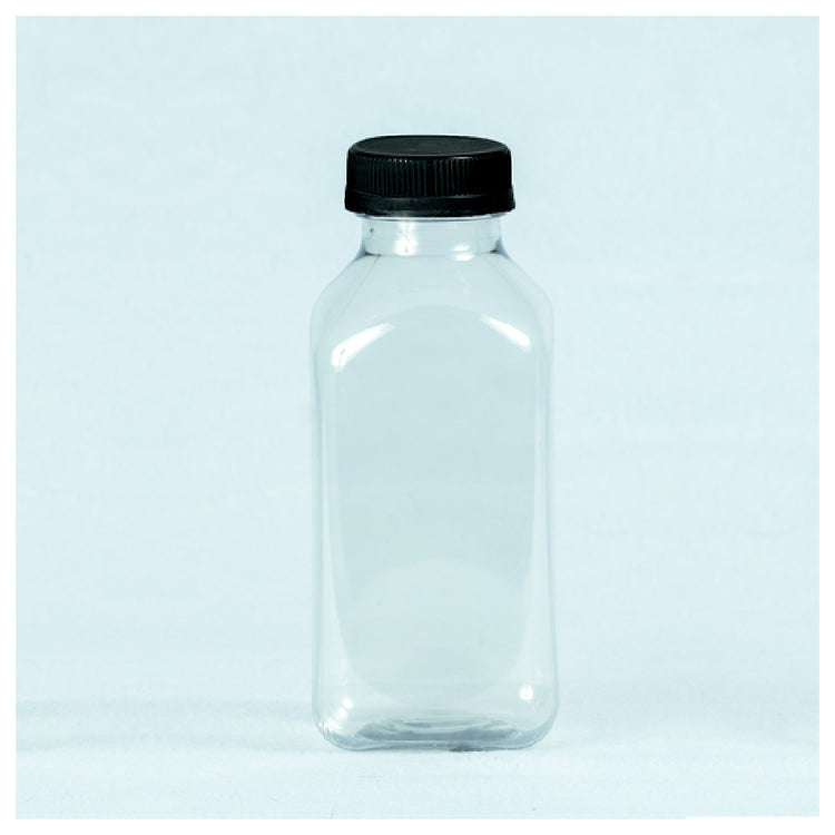 Buccaneer Container Corp, 31510120202, (Buccaneer) Juice Bottles, 12 oz., short, square, empty, combo packed with black lids, Clear PET, (custom printed), (144 each per case) (Packed By: 151 Each Per Case)