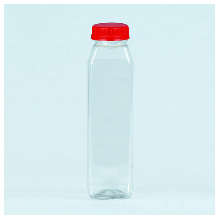 Buccaneer Container Corp, 31510120301, (Buccaneer) Juice Bottles, 12 oz., tall, square, empty, combo packed with red lids, Clear PET, (custom printed), (151 each per case) (Packed By: 151 Each Per Case)