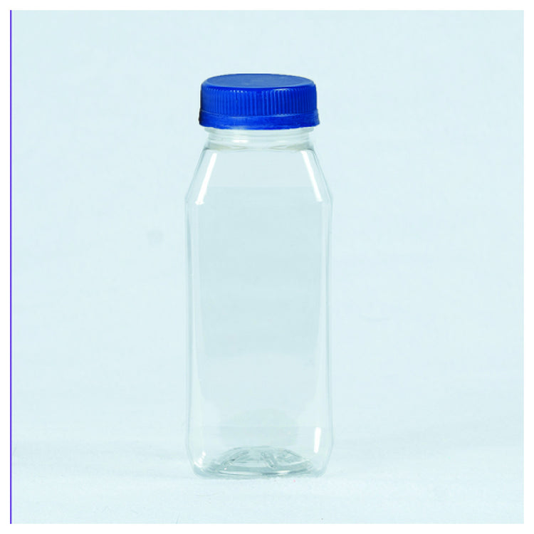 Buccaneer Container Corp, 32160080501, (Buccaneer) Juice Bottles, 8 oz., tall, square, empty, combo packed with royal blue lids, Clear PET, (custom printed), (216 each per case) (Packed By: 216 Each Per Case)