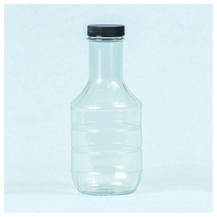 Buccaneer Container Corp, 9079016020, (Buccaneer) Sauce Bottle, 16 oz., clear PVC, empty, round, combo packed with black lids, includes pressure applied safety liners (custom printed) (79 each per case) (Packed By: 79 Each Per Case)