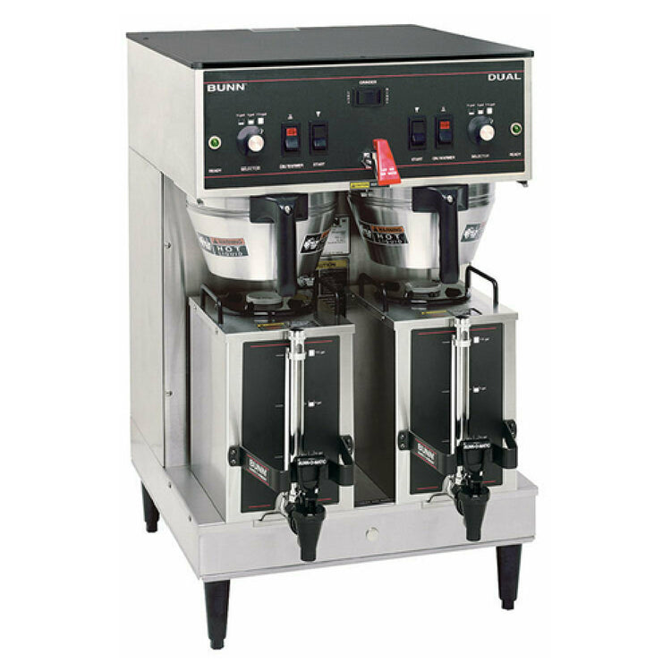 The Bunn 20900.0011 Dual® Coffee Brewer Portable Mechanical Thermostat is a high-capacity brewing system designed for professional environments, capable of producing up to 18.9 gallons per hour. This unit features a stainless steel funnel, enhancing durability and performance. It offers three batch-size settings, providing flexibility for varying demand levels. An electronic timer and grinder interface ensure precise control over the brewing process, while the upper hot water faucet adds convenience for multiple brewing needs. The brewer also includes a variable water bypass, allowing for tailored extraction results. Accompanying the machine are two GPR servers (model 20950.0004) which facilitate efficient service and delivery. The model stands on 4-inch black adjustable legs, providing stability and adaptability to different counter heights. Operating at 120/240 volts, 60 Hz, and single phase, the coffee brewer consumes 6890 watts and draws 29 amps, making it suitable for demanding commercial settings. This brewer is UL and NSF certified, confirming its compliance with high safety and quality standards. The Bunn 20900.0011 is ideal for cafes, restaurants, and large event caterers who require a versatile and reliable coffee brewing solution.