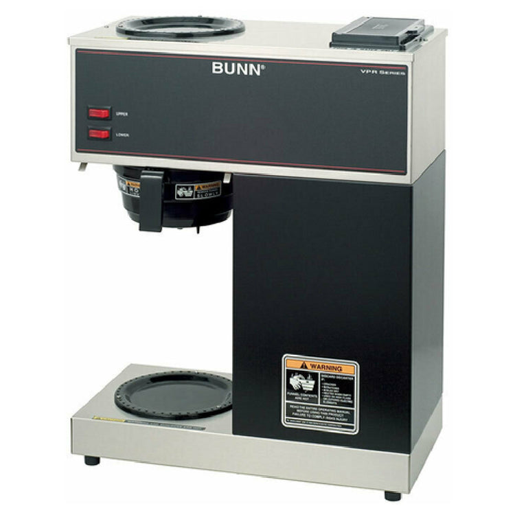 The Bunn 33200-0000 VPR Coffee Brewer is a high-performance pourover type machine engineered to meet the demands of various sectors in the food service industry. This coffee brewer boasts a capacity to brew up to 3.8 gallons of coffee per hour, making it an excellent choice for busy cafes, offices, and restaurants. It features a dual warmer configuration with one lower and one upper warmer, ensuring that multiple pots of coffee can be kept hot and ready for service simultaneously. The plastic funnel design facilitates easy handling and maintenance, enhancing its user-friendliness. With a sleek black finish, this brewer operates on 120v/60/1-ph with a power consumption of 1575 watts and draws 13.1 amps. The Bunn 33200-0000 is equipped with a NEMA 5-15P plug and comes with an attached cord for straightforward installation. Its compliance with UL and NSF certifications underscores its adherence to safety and quality standards, making it a reliable and efficient addition to any professional setting where high-volume coffee production is required. This coffee brewer's robust construction and efficient brewing capacity cater to the diverse needs of establishments looking to serve multiple cups of coffee efficiently without compromising on quality.