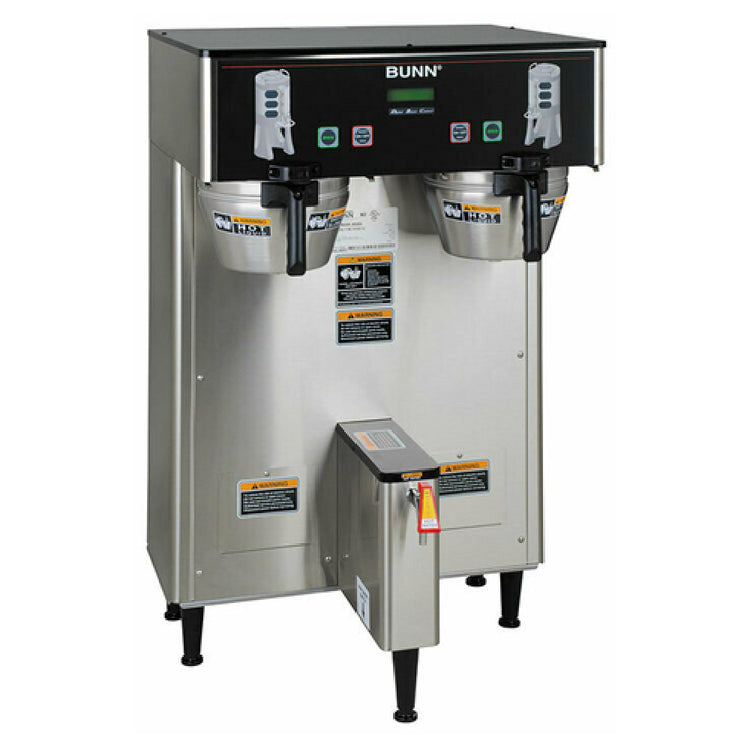 The Bunn 34600.0006 DUAL TF DBC® BrewWISE® ThermoFresh® Coffee Brewer - 16.3 Gal/hr is a highly efficient coffee brewing system designed for high-volume commercial use. With a remarkable brewing capacity of 16.3 gallons per hour, this brewer is engineered to meet the rigorous demands of busy cafés and restaurants. It integrates advanced coffee extraction technology through pre-infusion and pulse brew systems, ensuring optimal flavor profiles in every brew. Digital temperature control and a large spray head further enhance the brewing precision and consistency. This model boasts automatic programming and can store individual brewing recipes, providing both flexibility and convenience for diverse coffee menus. Constructed with a durable stainless steel finish, it includes a lower hot water faucet for additional beverage preparation needs. The brewer's design incorporates SplashGard® and optional funnel locks for safety and efficiency. The wireless brewer-grinder interface exemplifies its state-of-the-art innovation, simplifying operations for baristas. It accommodates two 1.5-gallon ThermoFresh servers, although these servers are sold separately. Operating on 120/208v/60/1-ph with a power output of 5700 watts and 27.4 amps, it is UL and NSF certified, ensuring compliance with industry standards. The Bunn 34600.0006 is an ideal choice for businesses seeking reliable, high-volume coffee brewing solutions.