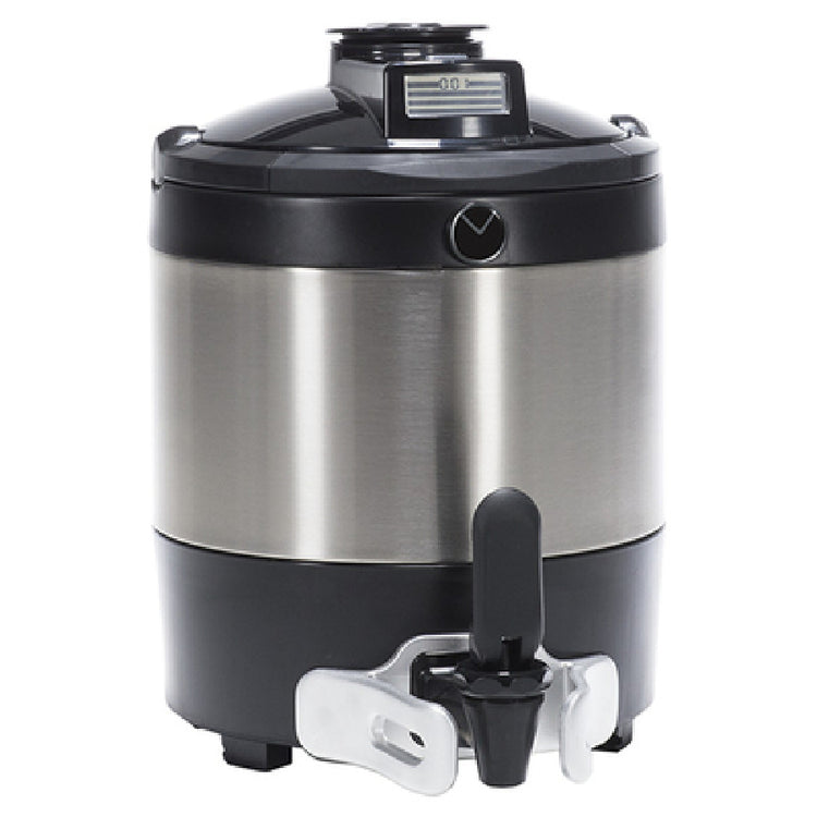 The Bunn 42700-0250 TF ThermoFresh® Server With Digital Sight Gauge Without Base is a highly functional, 1-gallon capacity server designed for seamless integration with twin or single Infusion Series brewers. This server is equipped with a brew-through lid, enhancing usability by allowing direct brewing into the server. Its lever action dispensing and battery-operated volume indicator display ensure precise and efficient serving, complemented by a 4-hour digital count-up timer for optimal freshness tracking. The server's vacuum-insulated stainless steel liner maintains beverage temperature, while its black finish adds a sleek, professional appearance. The soft-grip bail handle enhances portability, making it an ideal solution for various catering and hospitality environments. Additionally, the fast-flow faucet ensures quick service, protected by an aluminum faucet guard for added durability. Certified by NSF, this server meets high standards of safety and quality, catering to the needs of professional settings that demand reliability and ease of use. Its lack of a base allows for versatile placement options, expanding its utility across different market segments. This server represents a convergence of practical design and technical precision, offering a robust solution for beverage service operations.