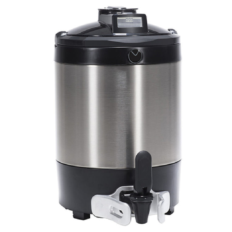 The Bunn 42750-0250 TF ThermoFresh® Server with Digital Sight Gauge is a high-capacity beverage server designed for commercial use, holding up to 1-1/2 gallons of liquid. This model operates without a base, featuring a lever action dispensing mechanism which ensures smooth and efficient pour control. A notable feature is its battery-operated volume indicator display, offering precise monitoring of beverage levels, accompanied by a 4-hour digital count-up timer that allows users to track freshness duration. The server is equipped with a brew-through lid, enhancing convenience during brewing and minimizing heat loss. Its portability is enhanced by a soft-grip bail handle, making transportation effortless. The fast flow faucet, safeguarded by an aluminum guard, provides rapid service while maintaining hygiene standards. Constructed with vacuum insulation and a stainless steel liner, the server ensures optimal temperature retention. Its sleek black finish complements any professional setting, making it a versatile asset for cafes or catering services. The Bunn 42750-0250 is compatible with twin or single Infusion Series brewers, adding flexibility to its use. NSF certification underscores its adherence to public health standards. This server combines functionality with a professional design, catering to various market segments requiring reliable, high-quality beverage service.