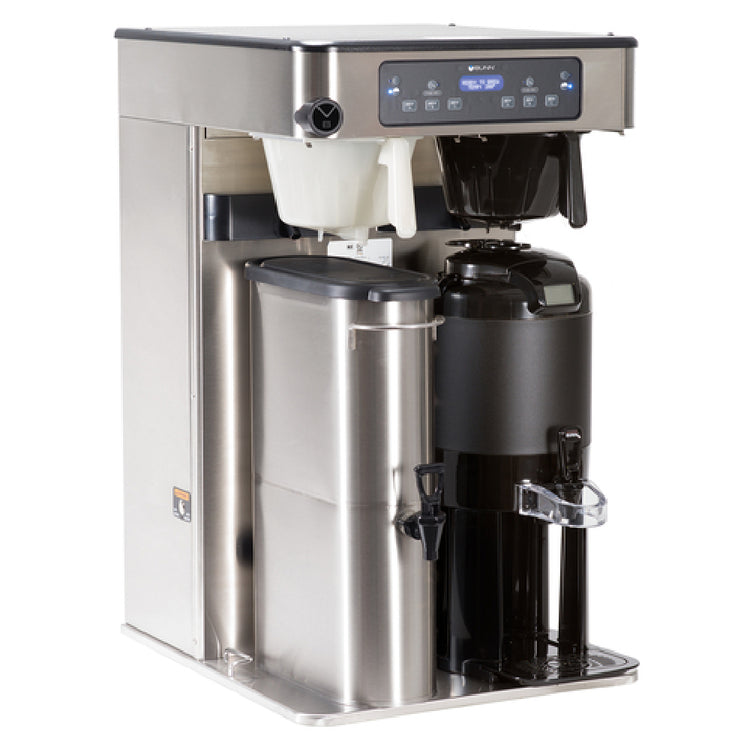 The Bunn 52400.0100 ITCB TWIN High Volume Tea/Coffee Brewer Double 5-1/2 Gallon Tank is a versatile unit designed for high-demand environments requiring both tea and coffee brewing capabilities. This innovative brewer boasts dual 5-1/2 gallon tanks, allowing simultaneous brewing on both sides, catering to a diverse range of beverage preferences. Its Infusion Series technology is a standout feature, offering three brew buttons and two batch sizes for customizable brewing options. The integrated tea dilution nozzle and specialized tea brewing funnel enhance the precision and quality of tea preparation. The brewer further incorporates a Peak Extraction Sprayhead and features pre-infusion and pulse brew technology, ensuring optimal flavor extraction. This unit is USB programming capable, facilitating easy software updates and customization to meet specific user requirements. Operating on a 120/240v/60/1-ph power supply with a 25-amp draw and a 6kW power rating, it is both UL and NSF certified, ensuring compliance with safety and quality standards. The attached cord provides convenience in installation and mobility. The Bunn 52400.0100 ITCB TWIN brewer is an ideal choice for cafes, hotels, and large-scale food service operations seeking a reliable, high-volume brewing solution with advanced technology features.