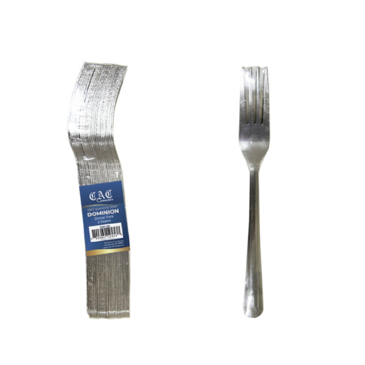 The CAC China 1201-05 Dominion Dinner Fork is a meticulously designed utensil measuring 7 1/8 inches in length, crafted from 18/0 stainless steel that ensures both durability and resistance to corrosion. This medium-weight dinner fork is ideal for various dining environments, providing a balance of strength and elegance that meets the needs of different market segments within the food service industry. Packed efficiently in cases of 25 dozen, it caters to the bulk requirements of large-scale operations such as restaurants, catering services, and hotels. The stainless steel construction offers a reliable option for establishments seeking utensils that combine both affordability and functionality. Suitable for high-volume settings, the design of the CAC China Dominion Dinner Fork ensures it can withstand the rigors of daily use while maintaining its aesthetic appeal. Its size and weight make it comfortable for diners, while its robust material assures long-term use, making it a practical choice for any professional dining setup. This dinner fork exemplifies a commitment to quality and value, serving as a versatile addition to a wide range of culinary establishments.