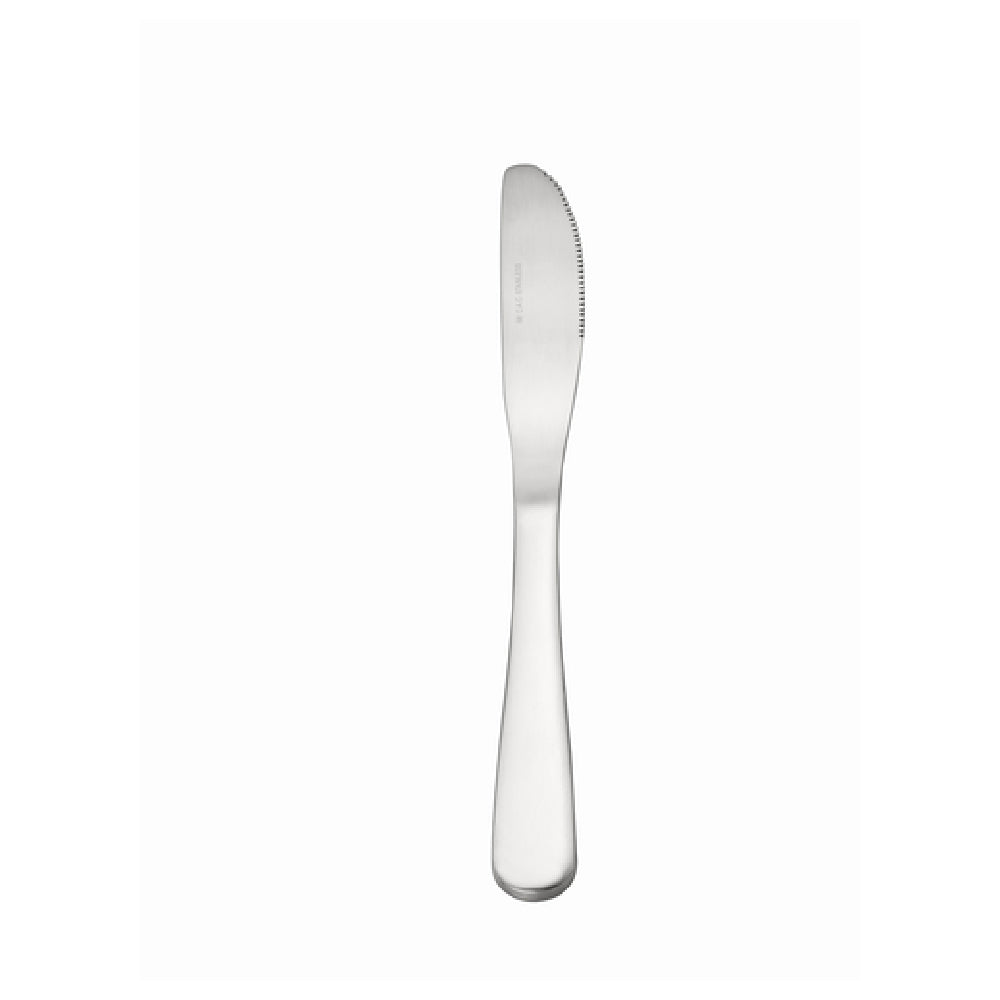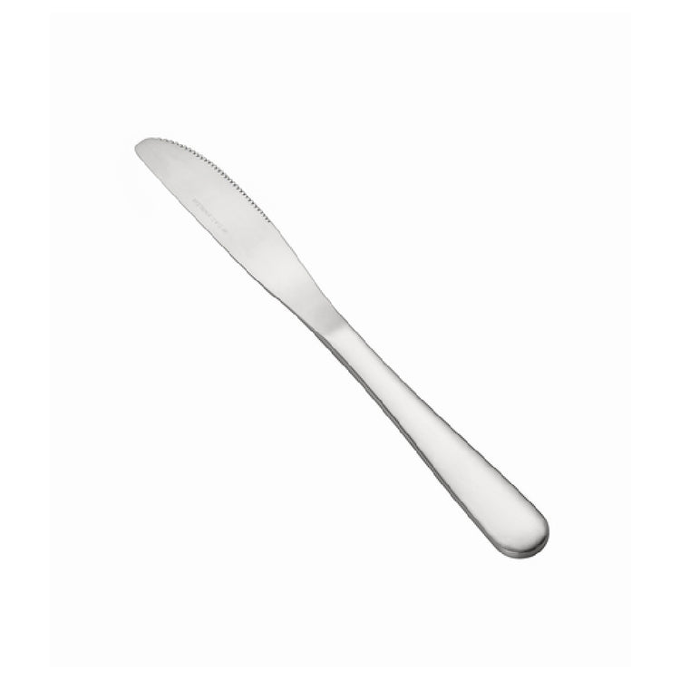 The CAC China 3003-08 Continental Dinner Knife 8-5/8"L Solid Handle is a meticulously crafted utensil designed to enhance dining experiences across various culinary settings. Measuring at 8-5/8 inches in length, this dinner knife boasts a solid handle that provides a comfortable and secure grip, ensuring ease of use during meal times. Constructed from heavy-weight 18/0 stainless steel, it offers a durable and sturdy design suitable for both domestic and commercial settings, such as restaurants and catering services. The knife's stainless steel composition ensures resistance to stains and corrosion, maintaining its aesthetic appeal over time. Packed by 25 dozen per case, this product is ideal for bulk purchases, catering to high-volume clientele who require reliable and consistent dining tools. The CAC China 3003-08 Continental Dinner Knife stands out in the food service industry for its blend of durability, functionality, and design, making it a valuable addition to any table setting. Its robust construction and sleek design make it a versatile choice for various dining environments, from casual dining to more formal settings, meeting the needs of diverse market segments with its quality and reliability.