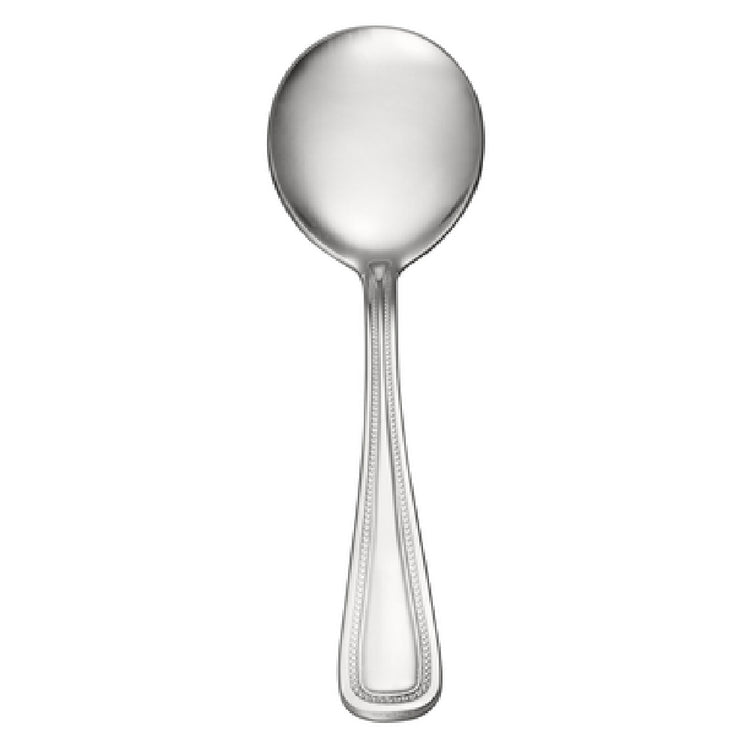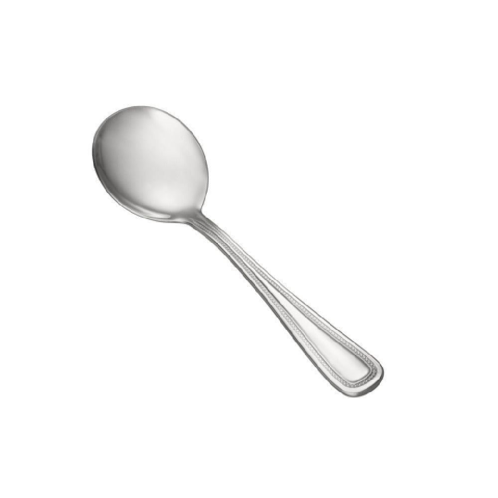 The CAC China 3008-04 Black Pearl Bouillon Spoon measures 6-1/8 inches in length and is crafted from heavy-weight 18/0 stainless steel, making it a durable choice for any dining setting. This spoon is designed for the food service industry, particularly beneficial for restaurants and catering services that require high-quality, long-lasting flatware. Its substantial weight provides a satisfying balance in the hand, enhancing the dining experience for guests. The classic and elegant Black Pearl finish adds a touch of sophistication, making it suitable for both casual and fine dining establishments. Packed in cases of 50 dozen, this product ensures ample supply for large-scale operations, reducing the frequency of reordering and streamlining inventory management. The 18/0 stainless steel construction, while economically priced, maintains resistance to rust and corrosion, ensuring a long service life and retaining its appearance even with frequent use. This bouillon spoon is perfect for serving soups, broths, and other liquid-based dishes, highlighting its versatility in various dining scenarios. Its design and durable construction make it an essential item for hotels, banquet halls, and other institutions that prioritize both functionality and style in their tableware selections.