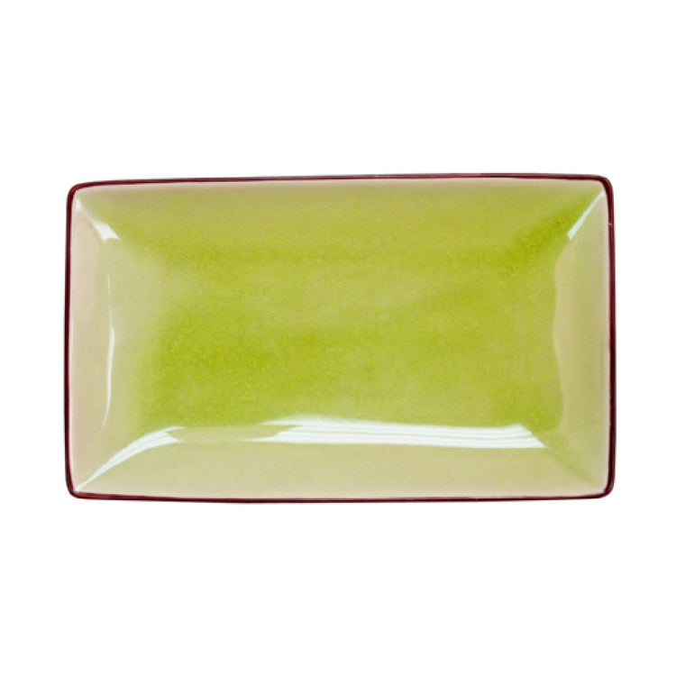 The CAC China 666-34-G Japanese Style Platter is a versatile and elegant serving solution measuring 8-1/2 inches in length, 5-1/2 inches in width, and 1-1/4 inches in height. Crafted from durable stoneware ceramic, this rectangular platter is designed with a reactive glaze in a striking Golden Green finish. The platter is dishwasher, oven, and microwave safe, making it a practical choice for both home and professional culinary environments. Each case contains two dozen platters, making it suitable for large-scale dining settings such as restaurants, catering services, or banquet facilities. This platter's Japanese-inspired design adds a touch of sophistication, enhancing the presentation of any dish. Its robust construction ensures longevity and reliability, while the reactive glaze provides a unique aesthetic appeal, making each piece distinct. The CAC China 666-34-G platter is an excellent choice for those seeking a blend of functionality and style in their serveware, catering to diverse market segments within the food service industry.