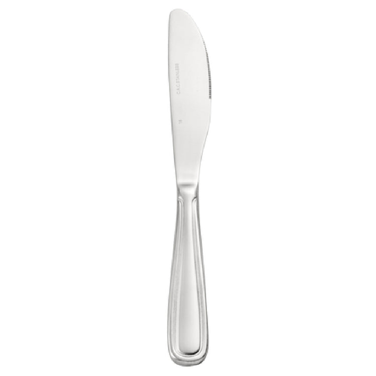 The CAC China 8002-15 Elite Table Knife, measuring 9-3/4"L, features a solid handle, providing a sturdy and reliable grip for a variety of dining settings. Crafted from 18/8 stainless steel, this knife boasts an extra heavy weight, ensuring durability and a premium feel that enhances the dining experience. The 18/8 stainless steel composition not only contributes to the knife's robustness but also offers excellent resistance to corrosion and stains, making it suitable for both high-end restaurants and casual dining atmospheres. This product is packed by 15 dozen per case, which is ideal for large-scale catering services, hotels, and restaurant supply chains, ensuring an ample stock for high turnover events or establishments. The solid handle design emphasizes comfort and control, appealing to professional chefs and home users alike who value precision and ease of use in their cutlery. This versatile table knife, with its substantial build and high-quality materials, is a valuable addition to any cutlery collection, catering to various market segments within the hospitality industry by providing reliable performance and lasting quality.