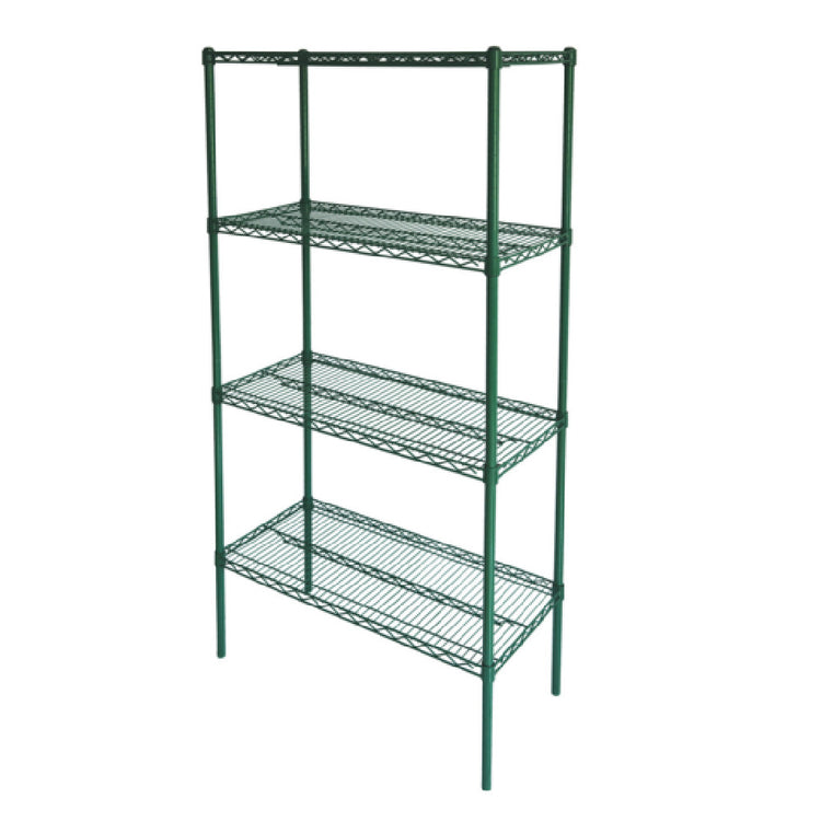 The CAC China AEWS-2448S Wire Shelving Set 48"L x 24"W x 72"H is a heavy-duty storage solution designed to meet the diverse needs of various industries. This set includes four robust shelves and four sturdy posts, complemented by 16 clips for secure assembly. With an impressive weight capacity of 850 lbs, it is ideal for accommodating substantial loads. The shelving is constructed from epoxy-coated metal, providing a durable and corrosion-resistant finish in a distinctive green hue. Notably, the product offers exceptional temperature resistance, functioning efficiently in environments ranging from -100°F to 500°F (-73°C to 260°C). This makes it suitable for applications in both extreme cold and heat. Furthermore, the shelving set is NSF certified, ensuring compliance with health and safety standards. It is conveniently sold by the case and packed as one complete set, offering a practical and reliable storage solution for sectors such as food service, warehousing, and manufacturing. The CAC China AEWS-2448S combines functionality with resilience, making it a valuable asset for organizations requiring dependable and versatile shelving solutions.