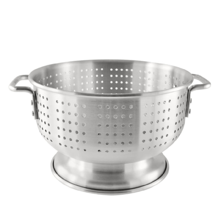 The CAC China ALCL-16SH Colander 16 Qt. 16" Dia. is a versatile and robust kitchen tool, ideal for both professional and home kitchens requiring reliable performance. With a substantial capacity of 16 quarts and a 16-inch diameter, this round colander is designed to accommodate large volumes, making it perfect for draining pasta, rinsing vegetables, or handling other food prep tasks involving substantial quantities. It features flat-handles which provide easy handling and maneuverability, ensuring a secure grip even when the colander is fully loaded. The footed design elevates the colander, allowing for efficient drainage and preventing contents from coming into contact with surfaces, thus maintaining hygiene. Made from durable aluminum, this colander is lightweight yet sturdy, designed to withstand the rigors of frequent use in busy environments. Packed by 4 each per case, it's suitable for restaurants, catering services, and other food service operations requiring multiple units for simultaneous use or replacement. The CAC China ALCL-16SH Colander balances practicality with durability, proving itself as a dependable choice for culinary professionals seeking efficiency and quality in their kitchen equipment.