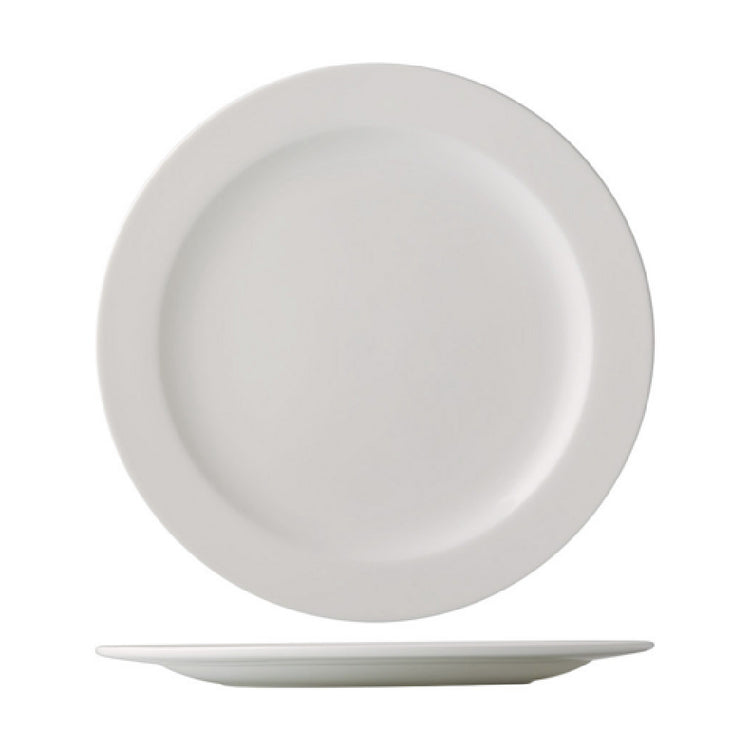 The CAC China ALP-20 Alps Plate 11-1/4" Dia. X 3/4"H Round is a versatile dining essential that combines functionality with elegance, suitable for various market segments within the hospitality industry. With a diameter of 11-1/4 inches and a height of 3/4 inches, this round plate is designed with a medium rim and a glazed foot, offering a sophisticated presentation for any culinary creation. Crafted from high-quality porcelain, it boasts a bone white finish that enhances its visual appeal and complements any table setting. The ALP-20 is dishwasher, oven, and microwave safe, ensuring convenience and flexibility in both preparation and cleanup processes. Sold by the case, each package contains one dozen plates, making it an ideal option for restaurants, catering services, and event planners looking to equip their establishments with durable and stylish tableware. The combination of durability, aesthetic appeal, and practical features positions the CAC China ALP-20 Alps Plate as a valuable asset for those seeking reliable and attractive solutions in the food service industry.
