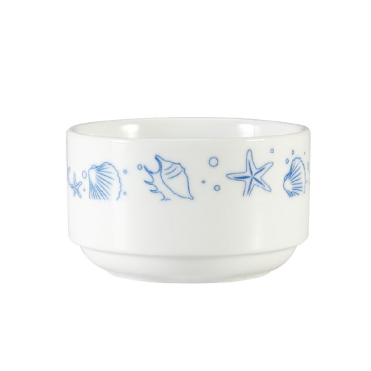 The CAC China ATC-48 Atlantic Seashell Bouillon Cup is a sophisticated porcelain dining piece, characterized by its 12 oz. capacity and a practical diameter of 4 inches with a height of 2-3/8 inches. This round bouillon cup is designed for stacking, providing efficient storage solutions for both commercial and domestic settings. It features a blue decorated rim against a super white porcelain backdrop, creating an elegant visual contrast that enhances dining aesthetics. The cup's material composition emphasizes durability, as it is safe for use in dishwashers, ovens, and microwaves, making it versatile for various culinary applications. Sold in cases packed by 3 dozen, the CAC China ATC-48 is particularly beneficial for bulk purchasing, serving restaurants, hotels, and catering services that require quality tableware in larger quantities. Its resilience and multipurpose nature allow it to withstand the demanding conditions of professional kitchens while offering aesthetic appeal for fine dining experiences. These features combined make it a valuable asset in diverse market segments within the foodservice industry, catering to both the functional and stylistic needs of culinary professionals and home users alike.