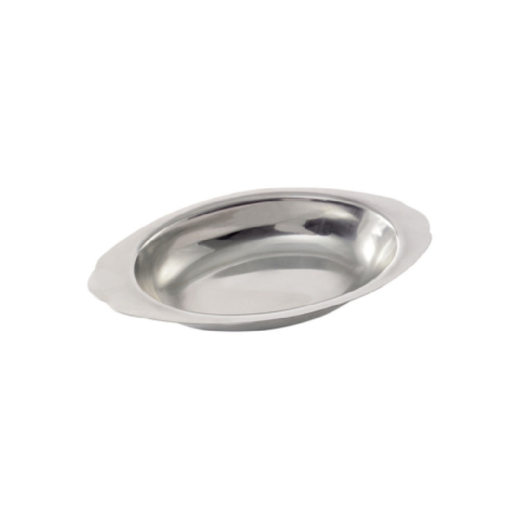 The CAC China AUDS-12 Au Gratin Dish Oval 12 Oz. is a meticulously crafted kitchen essential designed to enhance culinary experiences in both commercial and home environments. Notably distinguished by its oval shape and scallop-shaped handles, this dish offers a 12-ounce capacity, making it ideal for individual portions or side dishes. Its construction from premium stainless steel ensures durability and resistance to corrosion, while the mirror finish adds a touch of elegance to any dining presentation. The dish is oven-safe, affirming its suitability for au gratin dishes, casseroles, and other baked recipes, accommodating temperatures that allow for versatile cooking approaches. Sold in bulk with a packaging of 144 units per case, it caters to the high-volume needs of caterers, restaurants, and hospitality establishments. The CAC China AUDS-12 is an exemplary choice for chefs and culinary professionals seeking a reliable, stylish, and functional baking dish that delivers consistent performance and aesthetic appeal. Its thoughtfully designed features make it a valuable addition to any food service operation, ensuring both practicality for bulk usage and sophistication in dish presentation.