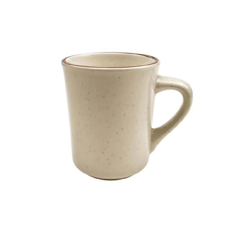 The CAC China AZ-17 Arizona Ventura Mug is an 8 oz. stoneware mug that combines durability with an elegant design, making it a versatile choice for various settings, from cafes to home kitchens. Measuring 3-1/8 inches in diameter and standing tall at 4 inches, this round mug offers a generous serving size that suits both hot and cold beverages. Its stoneware construction ensures long-lasting quality and makes it dishwasher, oven, and microwave safe, providing convenience for busy environments where efficiency is key. The mug features a distinctive Brown Rim and Brown Speckled pattern, contrasted with an American White base, adding a rustic yet sophisticated touch to its appearance. Sold by the case, with each case packed with three dozen mugs, it is an ideal option for businesses looking to maintain a cohesive and stylish presentation. The CAC China AZ-17 Arizona Ventura Mug is a practical and aesthetically pleasing solution for restaurants, hotels, and cafes, as well as for personal use, offering a blend of functionality and design that meets the diverse needs of different market segments within the food and beverage industry.