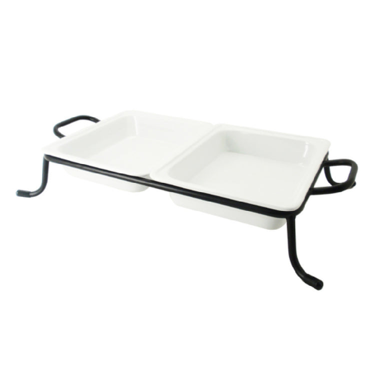 The CAC China BF-G212 GN Food Pan Set is a highly functional set that includes two 1/2 size food pans, each measuring 12-3/4"L x 10-3/8"W x 2-1/2"H. These rectangular pans are crafted from high-quality porcelain, ensuring durability and a sleek appearance. They are designed to be dishwasher, oven, and microwave safe, making them versatile for various food preparation and serving needs. The set also features a rectangular rack with divider bars and handles, enhancing its utility and ease of use. The pans and rack are finished in Super White, offering a clean and professional look suitable for any food service setting. Sold by case, with four sets per case, this product is ideal for restaurants, catering services, and buffet setups, where hygienic and efficient food storage and presentation are crucial. The CAC China BF-G212 GN Food Pan Set stands out for its practicality and robustness, making it a reliable choice for any culinary professional seeking quality serving ware.