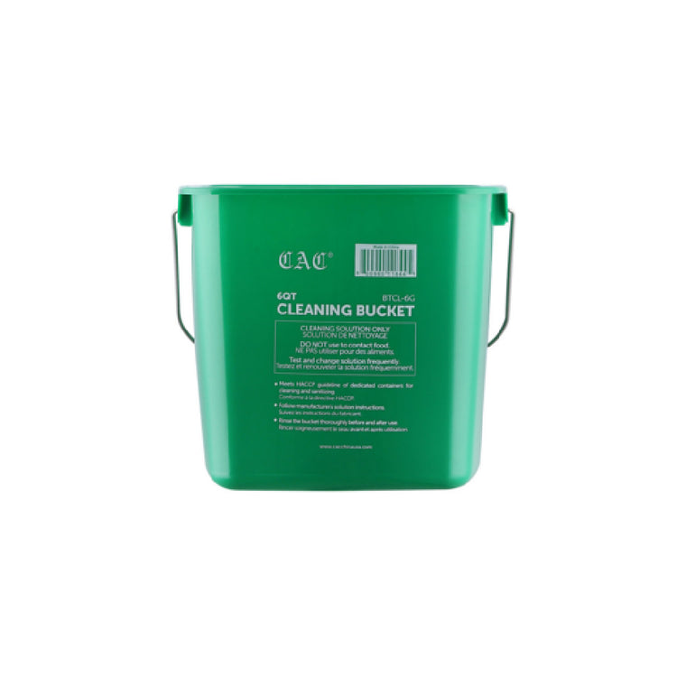 The CAC China BTCL-6G Bucket 6qt. for Cleaning is a meticulously designed cleaning solution tailored for various segments within the industry. This 6-quart bucket is HAACP color-coded, providing an essential tool for maintaining hygiene standards and reducing cross-contamination risks in environments where cleanliness is paramount. The vibrant green color ensures easy identification, enhancing organizational efficiency. A salient feature of this bucket is the inclusion of inner graduations, allowing for precise measurement of cleaning solutions, which is crucial for maintaining consistent cleaning protocols. Additionally, the multilingual instructions printed directly on the bucket—available in English, Spanish, and French—cater to a diverse workforce, ensuring that usage guidelines are accessible to a broad audience and promoting proper cleaning practices. With packaging at 12 each per case, it supports bulk purchasing, making it a practical choice for large-scale operations such as restaurants, healthcare facilities, and educational institutions where consistent and reliable cleaning tools are needed. This CAC China bucket combines functionality with thoughtful design, serving as a valuable asset for maintaining high standards of hygiene and efficiency in professional settings.