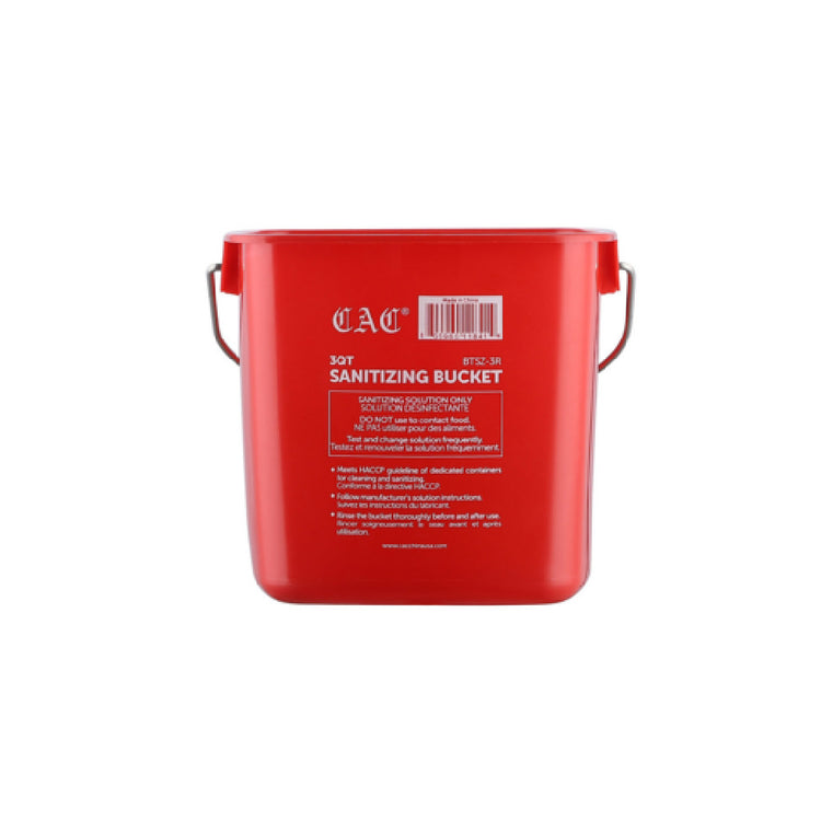 The CAC China BTSZ-3R Bucket 3qt. for Sanitizing is a meticulously designed tool, essential for maintaining hygiene across various industrial sectors. This 3-quart bucket is crafted specifically for sanitizing purposes, integrating HAACP color-coding to ensure compliance with health standards and facilitate easy identification in high-activity environments. The inner graduations provide precise measurement capabilities, enhancing accuracy during sanitizing procedures and reducing waste. A standout feature of this bucket is its multilingual instructions—printed in English, Spanish, and French—catering to a diverse workforce and enhancing usability in international settings. The vibrant red color not only adds to its visual appeal but also signals its dedicated purpose in the sanitation process, minimizing cross-contamination risks. Packaged with 12 units per case, it is well-suited for large-scale operations requiring bulk quantities, thus reducing the frequency of reordering. This product's robust construction and user-friendly features make it a versatile choice for restaurants, healthcare facilities, and any organization prioritizing cleanliness and safety. By combining practical design with compliance-driven features, the CAC China BTSZ-3R Bucket serves as a reliable and efficient solution for any sanitation-focused task across multiple industries.