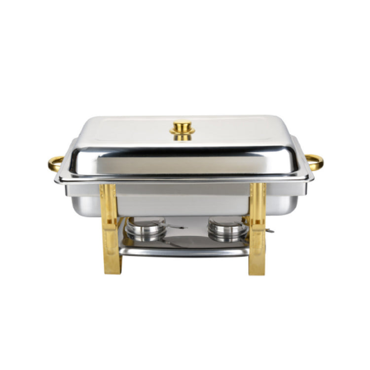 The CAC China CAFR-201 Luminous Chafing Dish 8 Qt. Full Size is a meticulously designed rectangular chafing dish, providing a seamless blend of practicality and elegance for food service professionals. This full-size unit is crafted from durable stainless steel, ensuring longevity and resistance to wear and tear. The inclusion of built-in lid hooks enhances user convenience, allowing for effortless access and storage solutions. The dish features a set of distinctive gold accent handles, comprising one top handle and two side handles, which add a touch of sophistication while facilitating easy maneuverability during service. This model includes a comprehensive set of components for optimal functionality, featuring one cover, one water pan, one food pan, and two fuel holders, providing all the necessary elements for efficient food warming and presentation. The 8-quart capacity caters to substantial quantities, making it ideal for large gatherings or events, appealing to a wide range of market segments including catering services, hotels, and banquet halls. The CAC China CAFR-201 is packed by one set, ensuring you receive a complete unit ready for immediate use, and embodies a blend of practicality, style, and robust features essential for the modern food service industry.