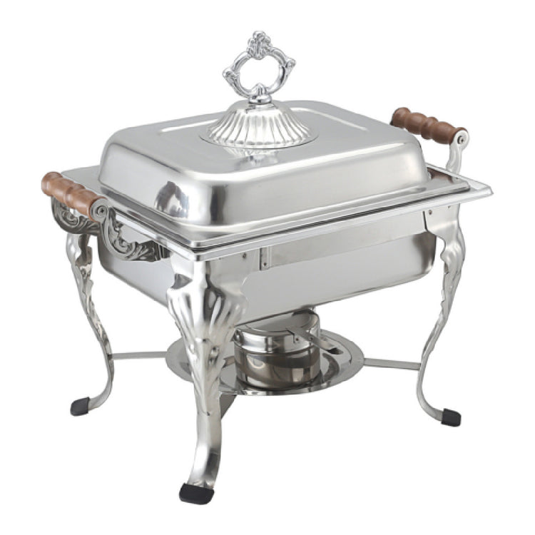 The CAC China CAFR-307 Welsh Chafing Dish 4 Qt. Square is an exemplary piece of kitchenware designed to meet various needs within the hospitality industry. This chafing dish boasts a 4-quart capacity, providing ample space for serving and maintaining the temperature of food items, making it suitable for buffets, catering events, and restaurant use. Its square design, alongside a decorative lid handle, not only enhances its aesthetic appeal but also ensures ease of handling. The dish is equipped with wood-colored side handles, adding a touch of elegance and facilitating safe transport. In addition, it features beveled legs with non-skid caps, which offer stability and prevent unwanted movement on serving tables. The set includes a cover, a water pan, a food pan, and two fuel holders, which are essential components for efficient food warming. Constructed from stainless steel, the chafing dish promises durability and resistance to both corrosion and staining, ensuring longevity in busy commercial environments. This product is packed as a single set, optimizing packaging and storage solutions for catering professionals. The CAC China CAFR-307 stands out for its combination of utility, design, and sturdiness, making it a valuable addition to any food service operation.