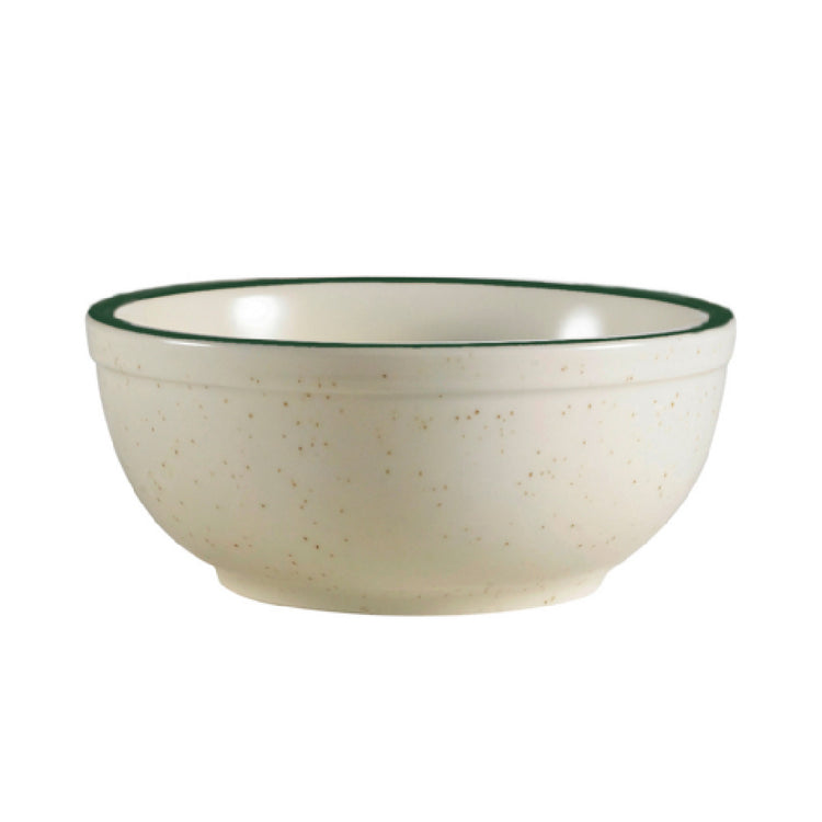 The CAC China CES-15 Emerald Nappie is a versatile stoneware bowl designed for various segments within the food service industry. With a capacity of 12-1/2 ounces, it is well-suited for serving soups, cereals, or desserts in both casual and fine dining settings. The bowl's dimensions are 5-5/8 inches in diameter and 2 inches in height, providing a compact yet functional size that complements a variety of table settings. The round shape of the Emerald Nappie features a narrow rim, which adds a touch of elegance while maximizing the serving area. Constructed from stoneware ceramic, this product ensures durability and long-lasting performance. The distinctive Emerald Rim and Emerald Speckled design pairs beautifully with the American White base, offering an aesthetic appeal that enhances any dining experience. This product is dishwasher, oven, and microwave safe, allowing for convenient use and easy maintenance in fast-paced environments. Sold by case, each case contains 3 dozen bowls, making it an efficient choice for restaurants, hotels, and catering services. The CAC China CES-15 Emerald Nappie is a practical and stylish solution for serving needs, combining functionality with an attractive design.