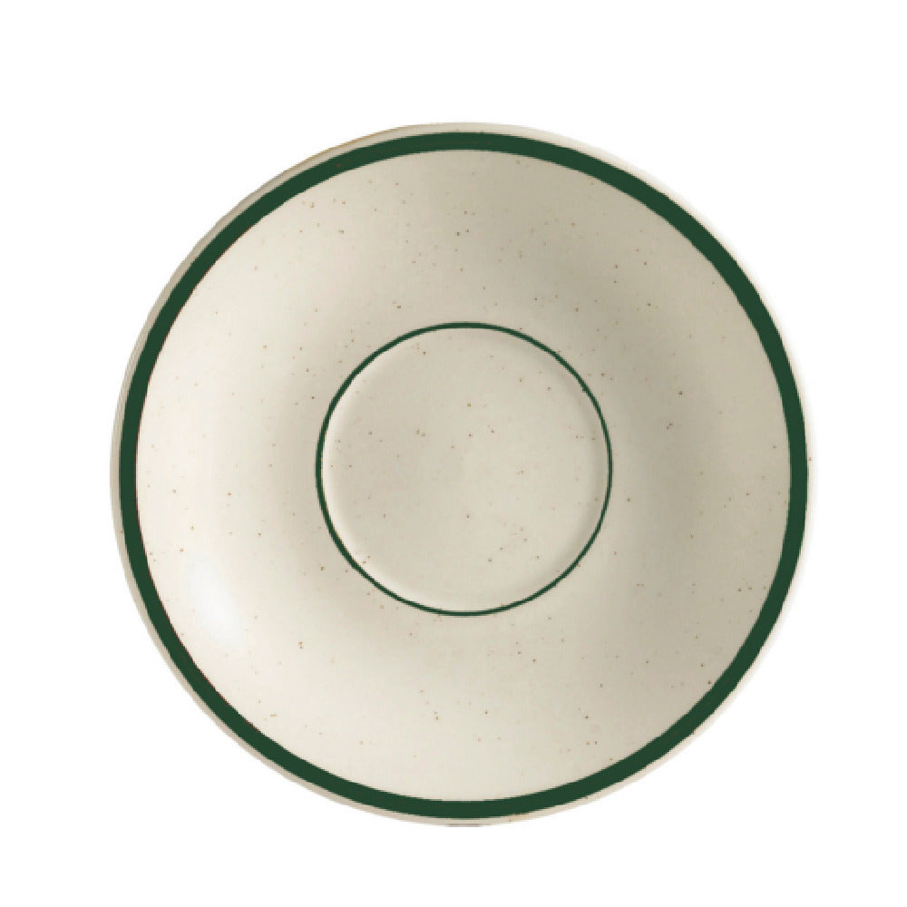 CAC China CES-2 Emerald Saucer is a versatile and durable tableware item with a diameter of 6 inches and a height of 1 inch, catering to various dining settings. Crafted from high-quality stoneware, this ceramic saucer features an elegant emerald rim with speckled detailing set against a classic American white background, offering a sophisticated aesthetic to complement any table decor. Its robust construction ensures it is both dishwasher, oven, and microwave safe, making it a practical choice for busy food service environments. This saucer is sold by the case, with each case containing three dozen pieces, making it an efficient purchase option for restaurants, cafes, and catering services looking to maintain a consistent supply of stylish and functional tableware. With its combination of aesthetic appeal and practical features, the CAC China CES-2 Emerald Saucer is an excellent choice for establishments aiming to provide a memorable dining experience. Its design and durability make it suitable for both casual and formal dining occasions, ensuring versatility across different segment markets within the hospitality industry.