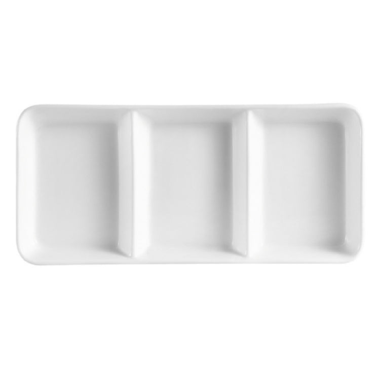 The CAC China CN-3T13 CN Divided Side Dish Plate is a specialized dining solution designed for efficient food presentation and portion control. With each of its three compartments holding up to 6 oz., this rectangular plate measures 12-1/2" in length, 5-1/2" in width, and 1-1/8" in height. Constructed from high-quality porcelain in a Super White finish, it offers both durability and elegance, making it suitable for various dining environments. The plate's design ensures its compatibility with dishwashers, ovens, and microwaves, providing flexibility and convenience across different kitchen settings. This makes it an ideal choice for establishments ranging from casual to fine dining restaurants, as well as catering services that require versatile and reliable serving ware. Sold by the case, with a dozen plates packed per case, it is a practical option for businesses looking to maintain a consistent and professional presentation. The CN-3T13 plate's divided structure not only aids in portion management but also enhances the dining experience by keeping different food items separate, thus preserving their individual flavors and textures. Its thoughtful design and robust material make it a valuable asset in any food service operation that prioritizes quality and functionality.